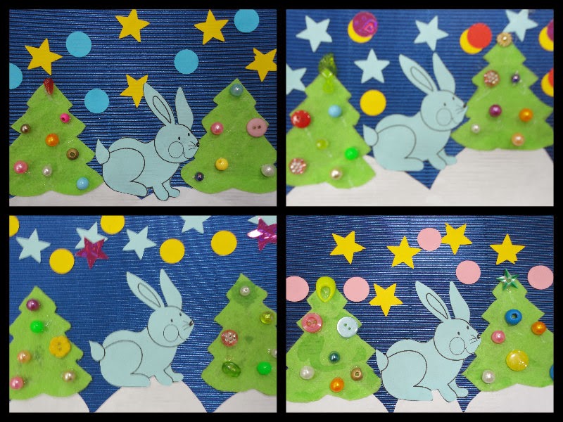 Зайчиков мы распечатали на принтере. Звезды и круги вырезали с помощью фигурных дыроколов. Они опять нас выручили.